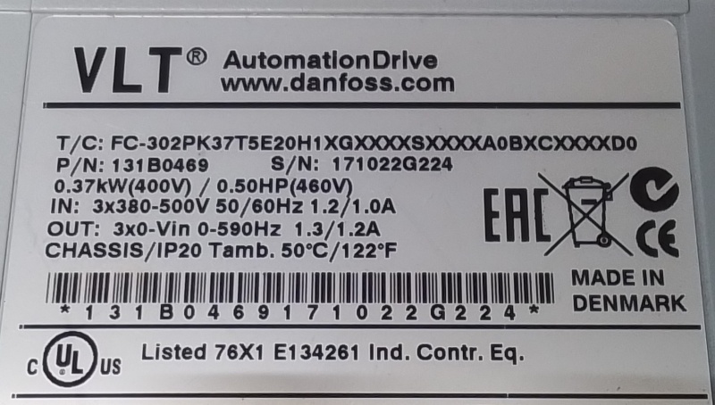 Ingang: 3x 380 - 500VAC, 50/60Hz, 1.2/1.0A