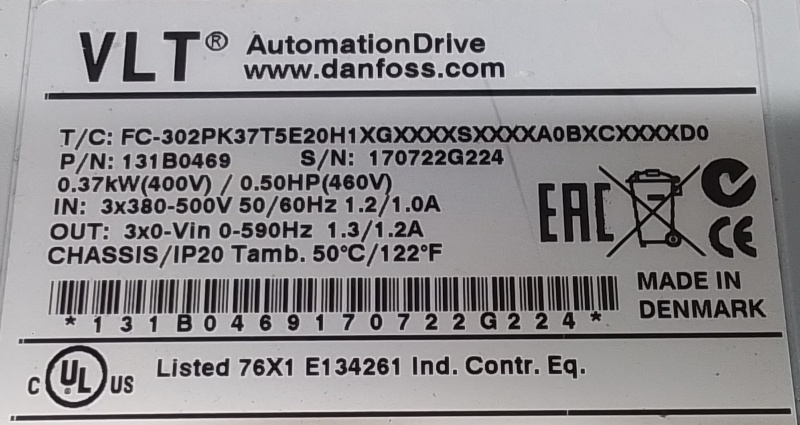 Ingang: 3x 380 - 500VAC, 50/60Hz, 1.2/1.0A