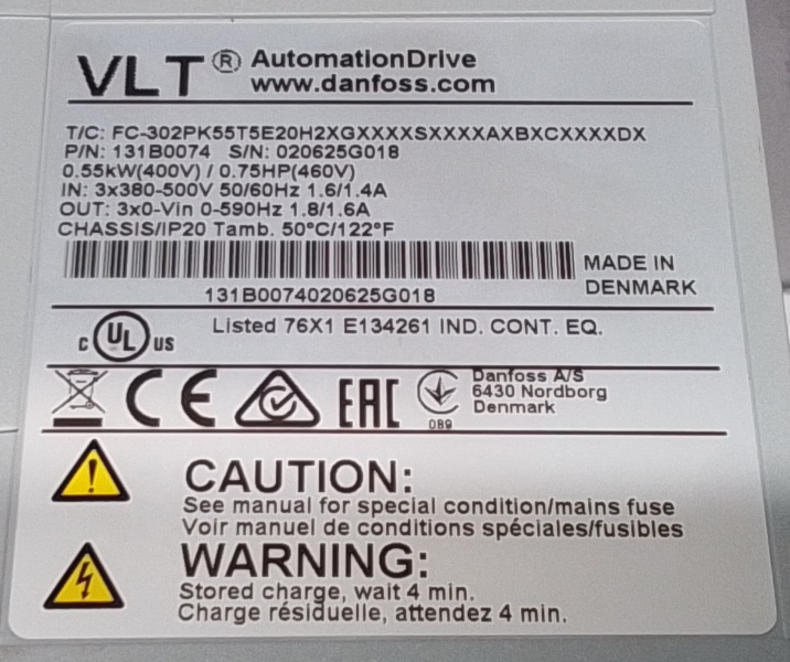 Ingang: 3x 380 - 500VAC, 50/60Hz, 1.6/1.4A