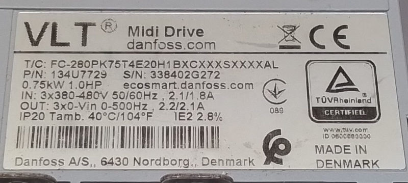 Ingang: 3x 380 - 480VAC, 50/60Hz,2.1/1.8A