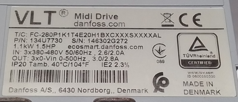 Ingang: 3x 380 - 480VAC, 50/60Hz,2.6/2.0A