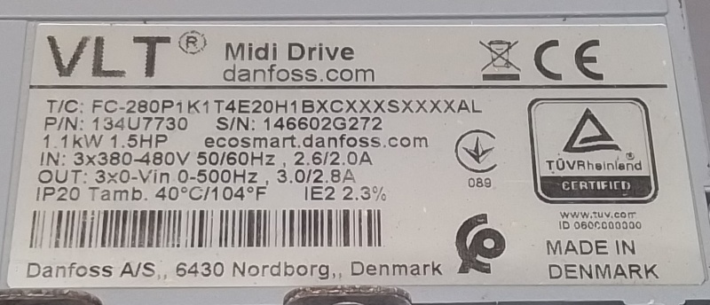 Ingang: 3x 380 - 480VAC, 50/60Hz,2.6/2.0A