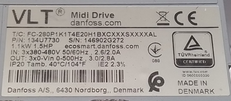 Ingang: 3x 380 - 480VAC, 50/60Hz,2.6/2.0A