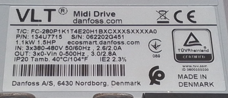 Ingang: 3x 380 - 480VAC, 50/60Hz,2.6/2.0A
