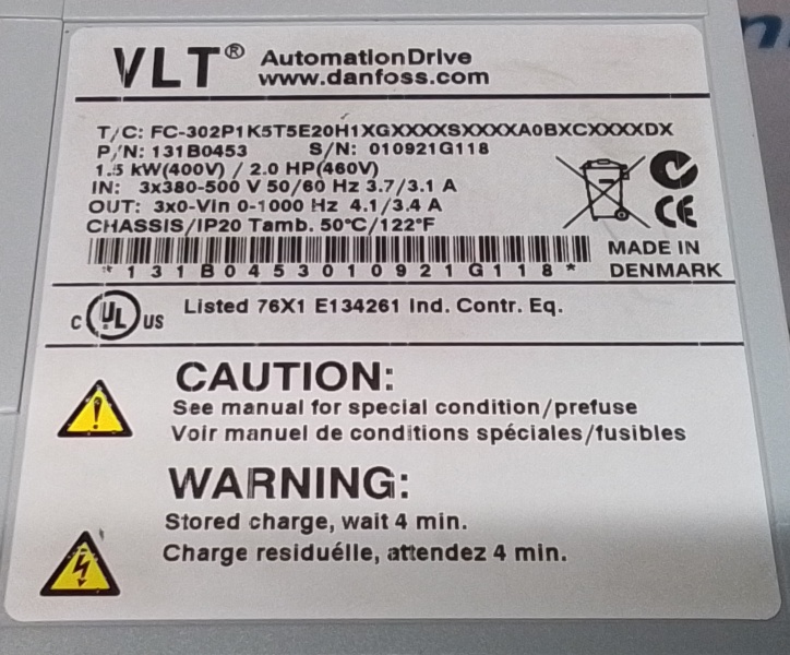 Ingang: 3x 380 - 500VAC, 50/60Hz, 3.7/3.1A