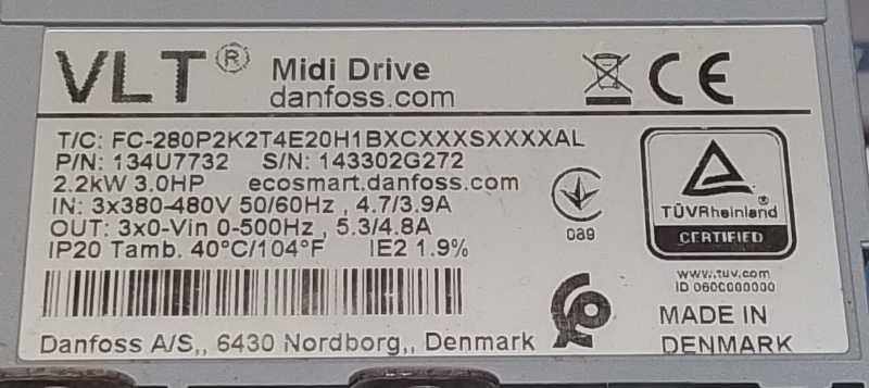 Ingang: 3x 380 - 480VAC, 50/60Hz,4.7/3.9A