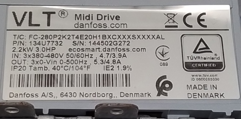 Ingang: 3x 380 - 480VAC, 50/60Hz,4.7/3.9A