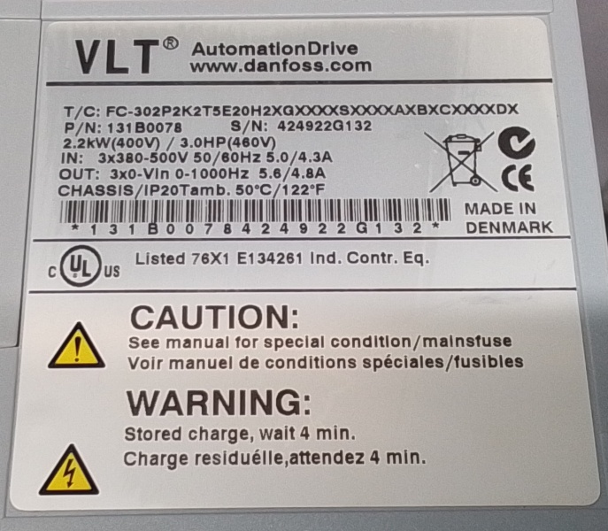 Ingang: 3x 380 - 500VAC, 50/60Hz, 5.0/4.3A