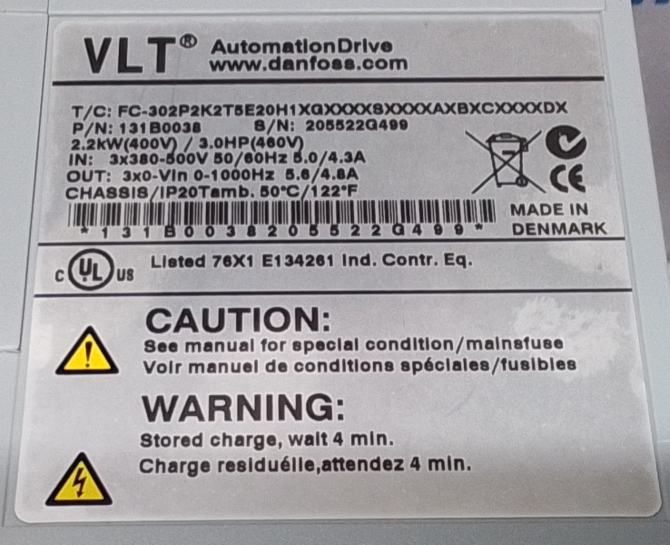 Ingang: 3x 380 - 500VAC, 50/60Hz, 5.0/4.3A