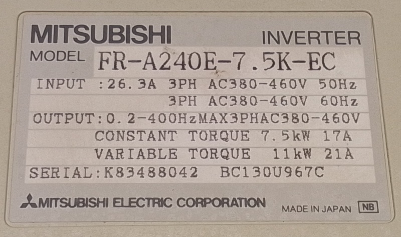 Uitgang: AC 380-460V, 3fasen, 0.2-400Hz, 17A(Variable)/21A(Constant)
