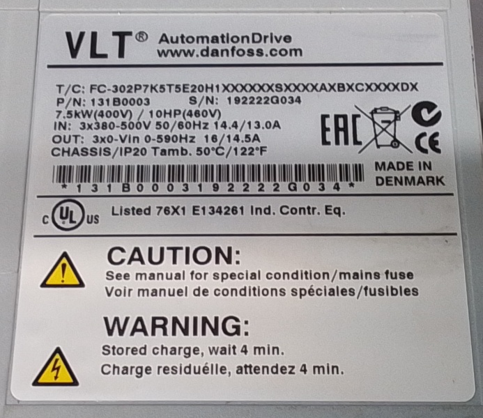 Ingang: 3x 380 - 500VAC, 50/60Hz, 14.4/13.0A